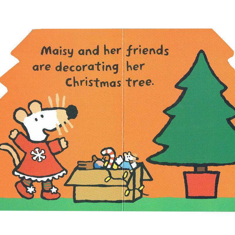 大きなツリーを準備して、お友達と1ページごとに「ライト」「オーナメント」等をクリスマスツリーに飾っていくメイシーちゃん。