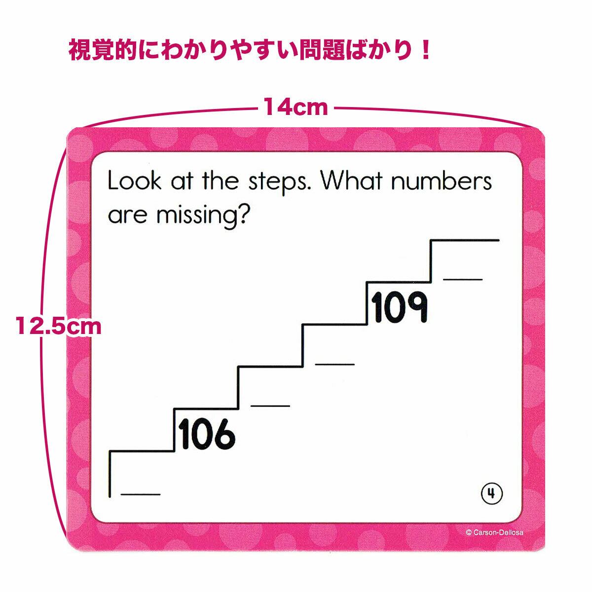 幼児向けの物より少し難易度があがっており、100以上の数の順列や、数字の規則を見つける問題、足し算引き算を両方使う問題や、電卓を使って答えを考える問題などが出題されます。