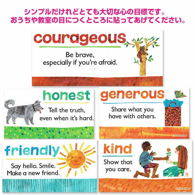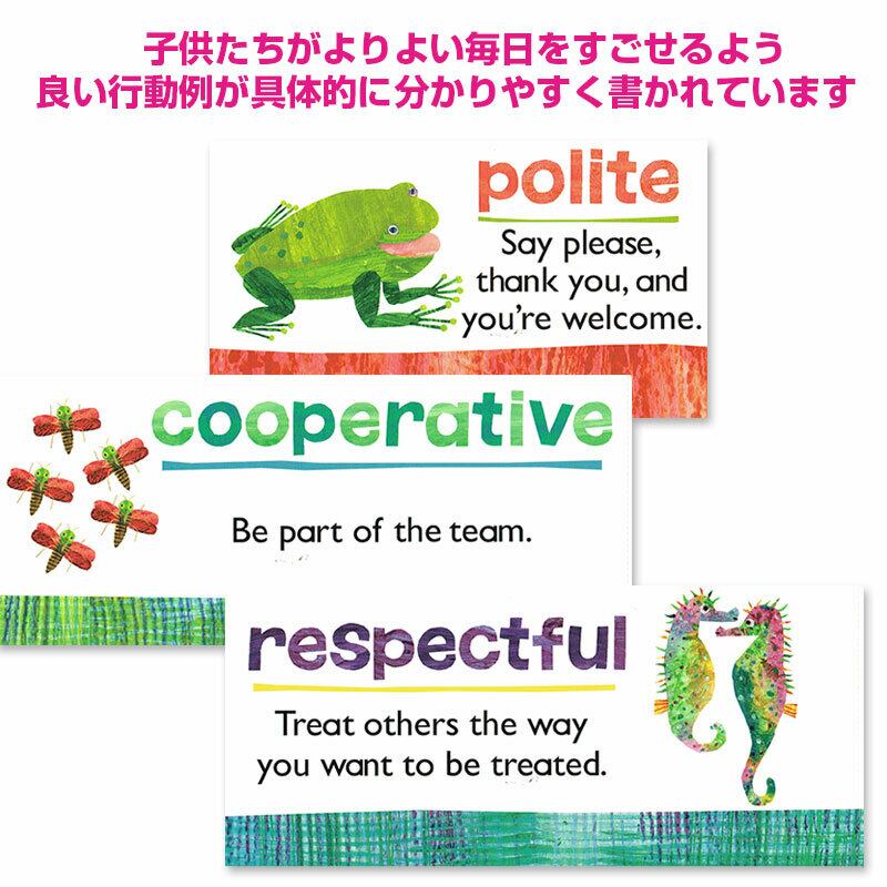 「Hello!と声をかけよう」「新しい友達をつくろう!」といった、シンプルで大切な具体的な行動目標が、エリックカールの明るいイラストと共に英語で書かれています。