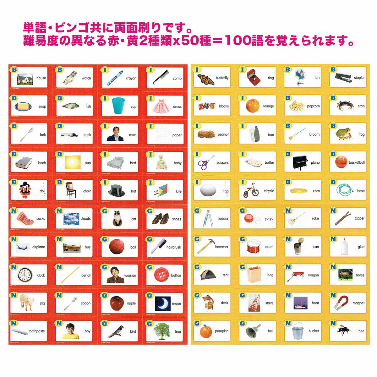 赤と黄色の2種類の難易度があり、合計100個の英単語を使ったビンゴゲームを楽しむことができます。