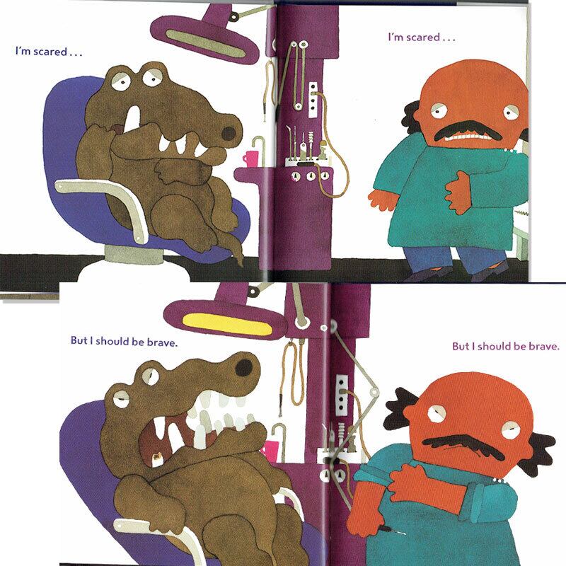 虫歯になったワニさんと、ワニが怖い歯医者さんが、お互いを怖がりながら、全く同じ文章で自分を励ましつつ虫歯を治療する、面白いお話です。