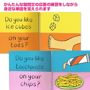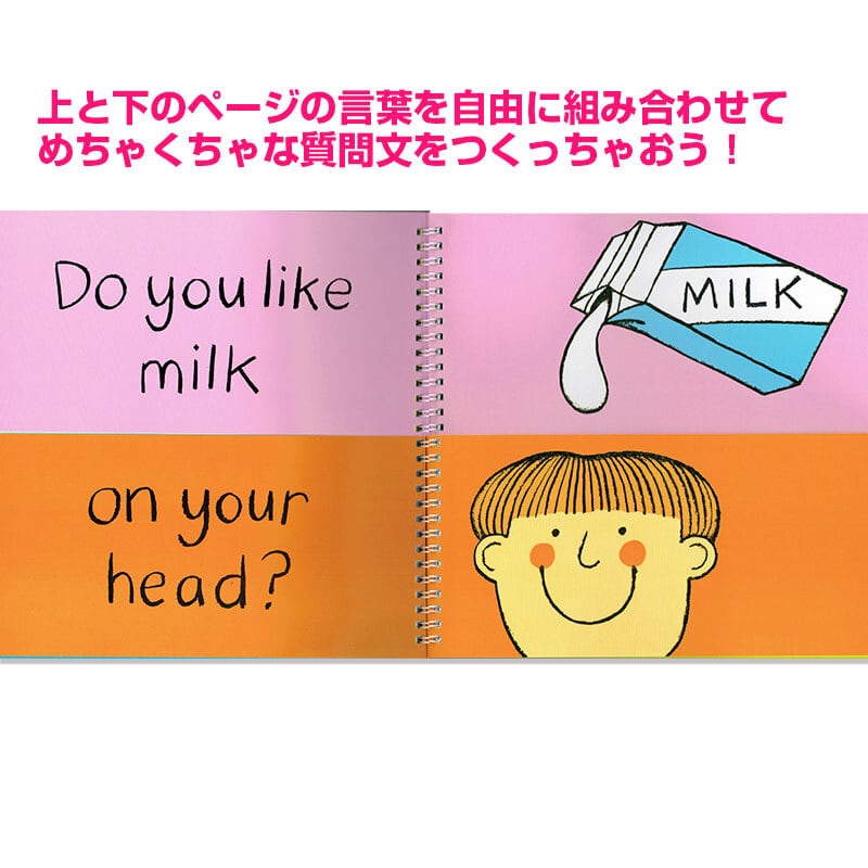 例えば「Do you like milk」を上で選択した場合は、下段で「on your cornflakes?」を選べば、子供たちは「Yes!」と答えられますが、「on your head?」「on your bed?」などを選んだ場合は、笑いながら「Noooo!!」と答えてくれることでしょう。