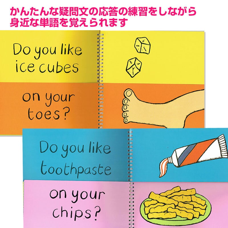 例えば「Do you like milk」を上で選択した場合は、下段で「on your cornflakes?」を選べば、子供たちは「Yes!」と答えられますが、「on your head?」「on your bed?」などを選んだ場合は、笑いながら「Noooo!!」と答えてくれることでしょう。