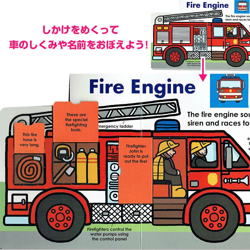 車のドアなどをパタパタあけて、しくみを英語で学ぶことができる絵本です。