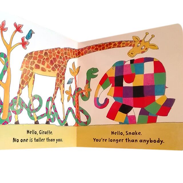 カラフルなエルマーや仲間たちと一緒に、擬音やtall、short など、ごく簡単な英語を学ぶことができます。